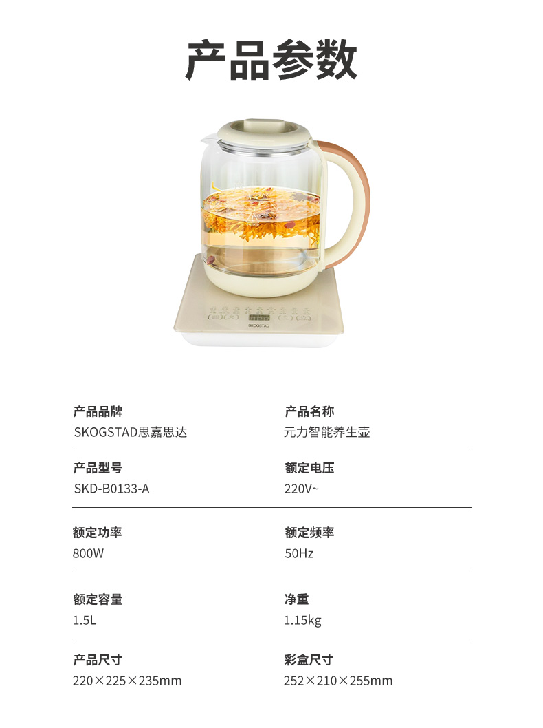思嘉思达元力智能养生壶SKD-B0133-A养生壶电水壶迷你家用煮茶器煮茶壶 全自动多功能热水烧水壶花茶壶1.5L