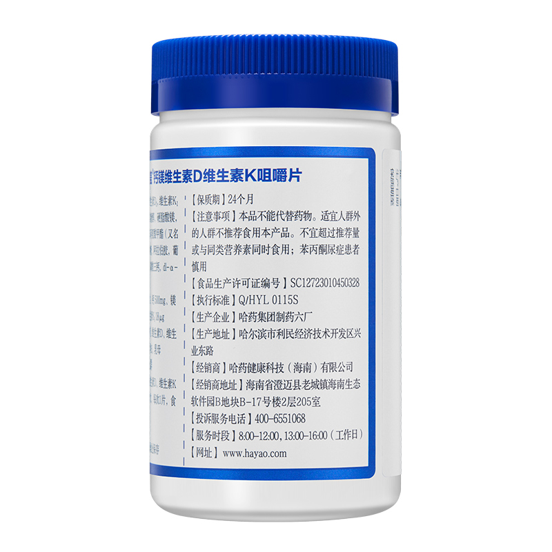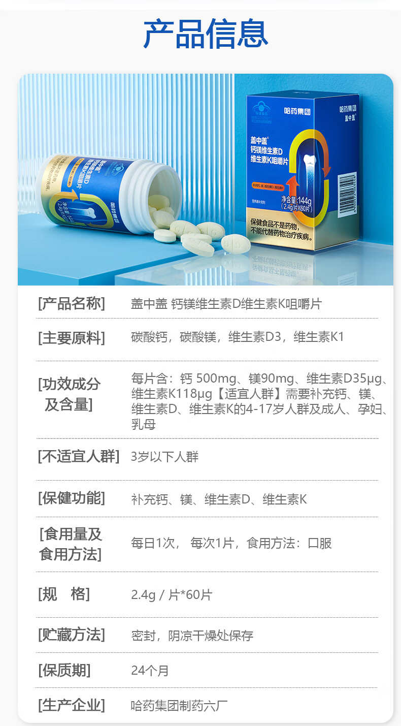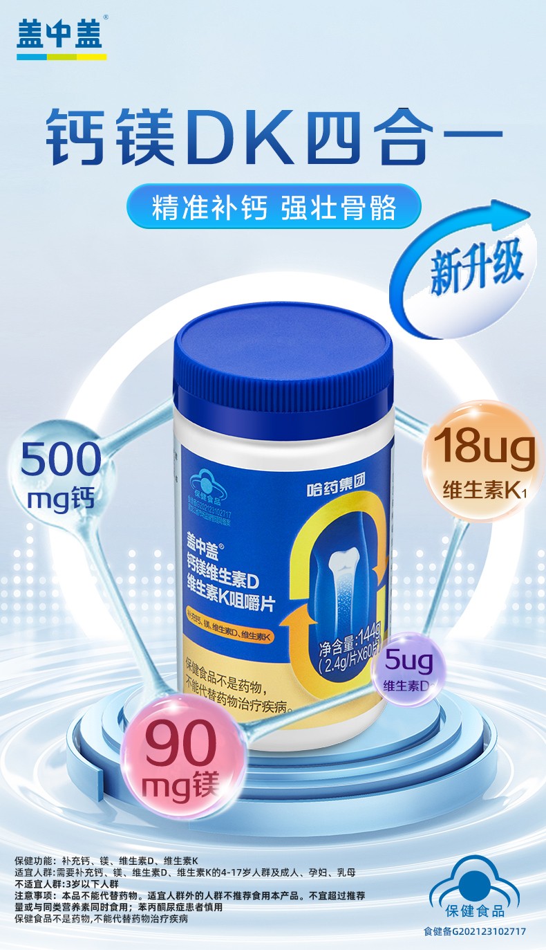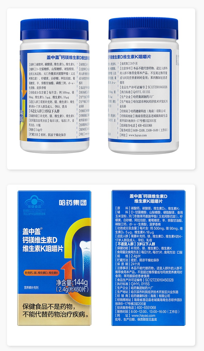 哈药盖中盖鸿洋神牌钙镁维生素D维生素K咀嚼片60粒